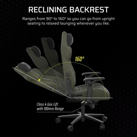 El respaldo se reclina desde 90° hasta 160°, ofreciendo la posibilidad de cambiar entre una postura erguida para trabajar o jugar y una posición reclinada para descansar o ver contenido de forma relajada.